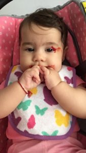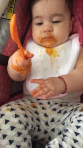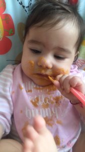 Még mindig kb. 60%-ban anyatejes, de ezelőtt 5 hónapja azt gondoltam, hogy sosem fog csökkenni a szopik száma, és megtört a jég. Mostanában is van olyan nap, amikor semmi mást nem akar, csak anyatejet. Nem erőltetem az étkezéseket sem, mert látom, hogy érdeklődik az után, hogy mi van a tányérunkban, előszeretettel kotorászik benne. Ügyesen használja a villát is már!