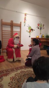 Játék közben körbe ültünk, egy nagyon kedves hölgy közölte, hogy a Mikulás már úton van, elénekeltük a „hull a pelyhes fehér hó” című dalt, és megkaptuk a kis csomagunkat.