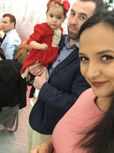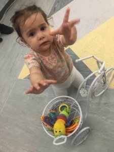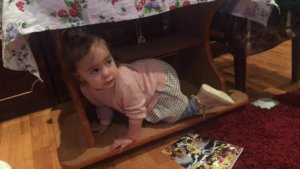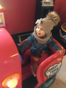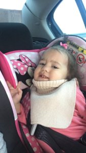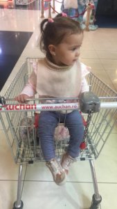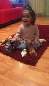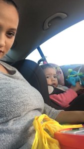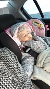 Az anyósülésre is került 2 nagyobb táska. Emma és én pedig hátul ültünk. Lábamnál az útravaló elemózsiával, 2 zacskó játékkal, tablettel, ami tele van mesékkel és egy nagyobb takarót is készítettem be, mert reggel hideg van a kocsiban. 14 óra utazás után megérkeztünk a nagyszülőkhöz, akik már nagyon vártak minket, de főképp a kisasszonyt!