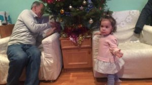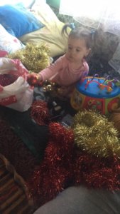 Minden dísz érdekelte. Boák, füzérek, gömbök, figurák. Mindegyiket meg kellett fognia, volt, amit egész ott tartózkodásunk alatt nem engedett el.